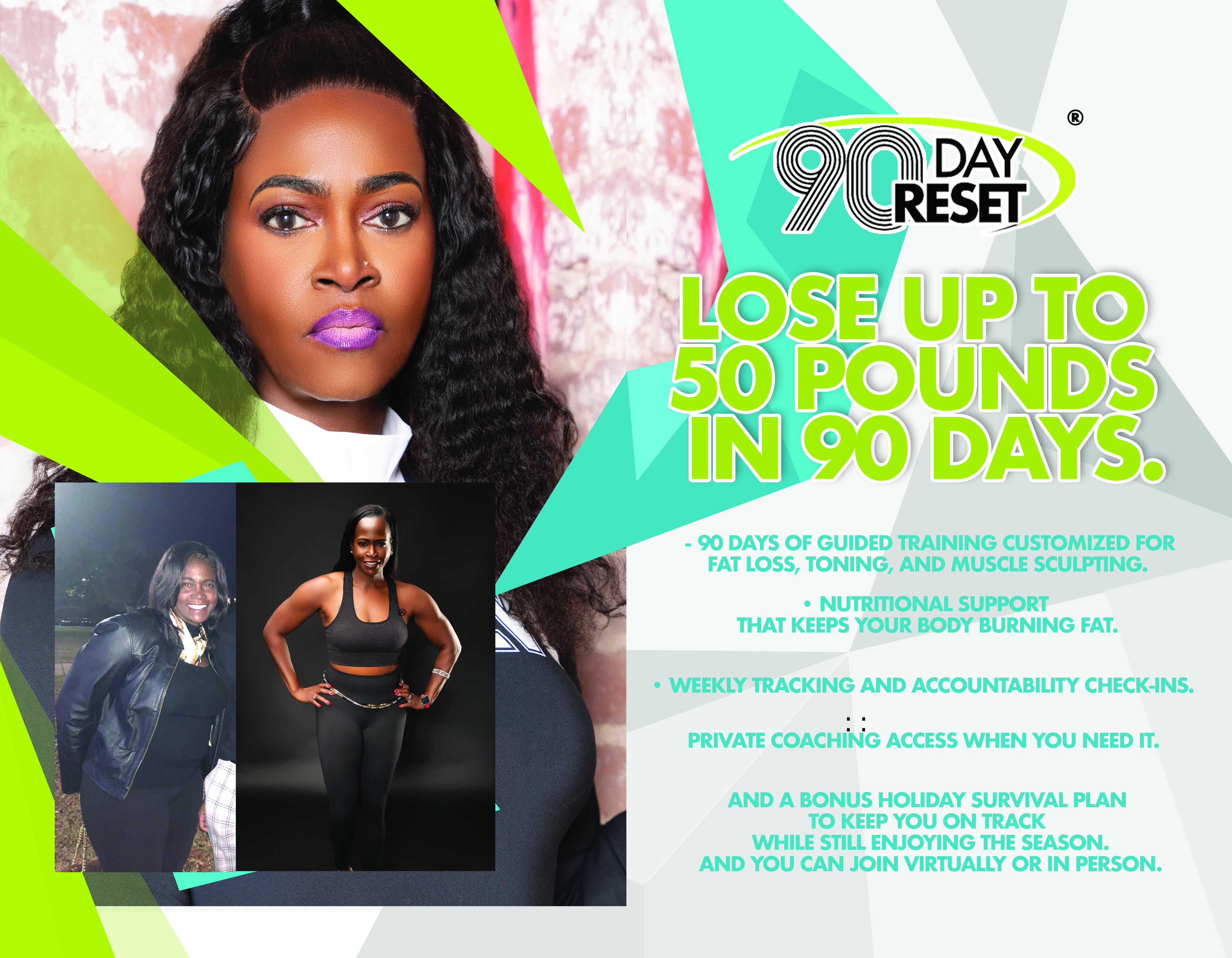 Say goodbye to stubborn weight, low energy, and inconsistent habits. With our Dynamic 90-Day Reset, you’ll experience rapid fat loss, a renewed mindset, and a complete lifestyle transformation from the inside out.